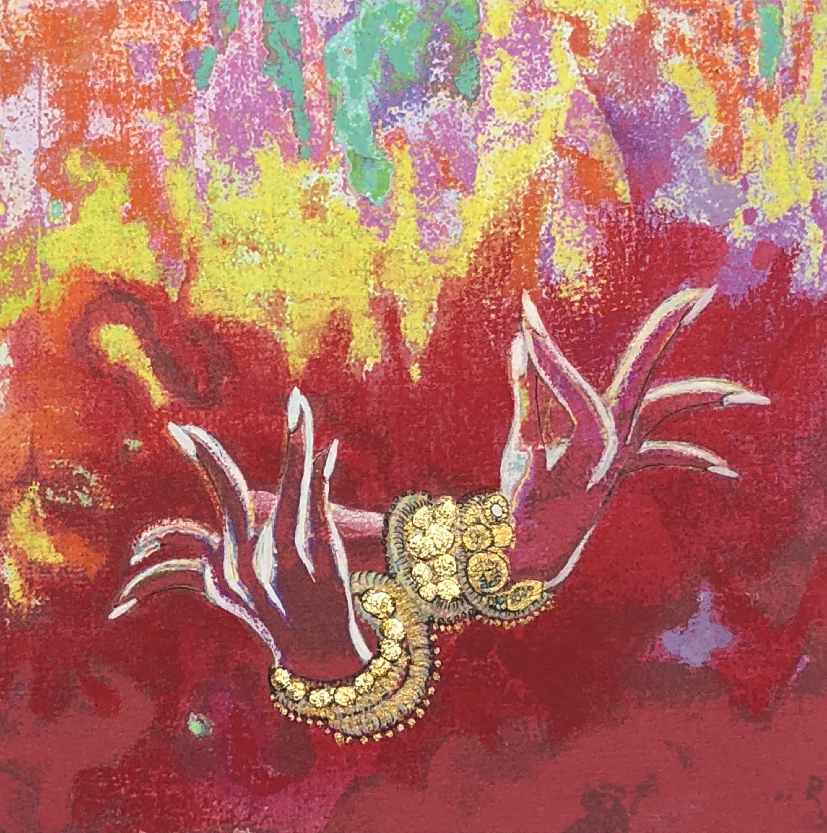 (Pastels, feuille d'or et encre sur papier Canson 130 g 20 x 20 cm)
